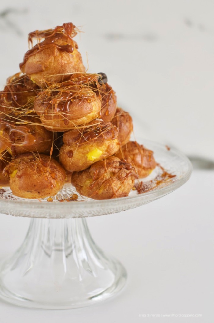 Si tratta di una montagna di bignè con morbida crema all’interno, tenuti insieme da fili di caramello. Morbidi dentro e croccanti fuori.