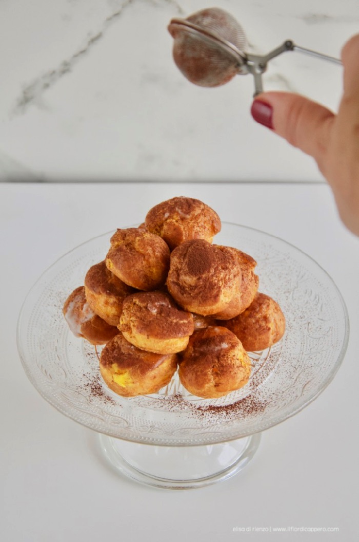 - Farcite i bignè con la crema mascarpone, aiutandovi con una sac a poche. Spolverizzateli con del cacao.