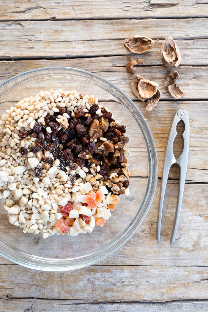 Metteteli in una ciotola con l’uvetta, le noci e mandorle tritate, i pinoli, le scorze grattugiate di limone e arancia e i canditi.