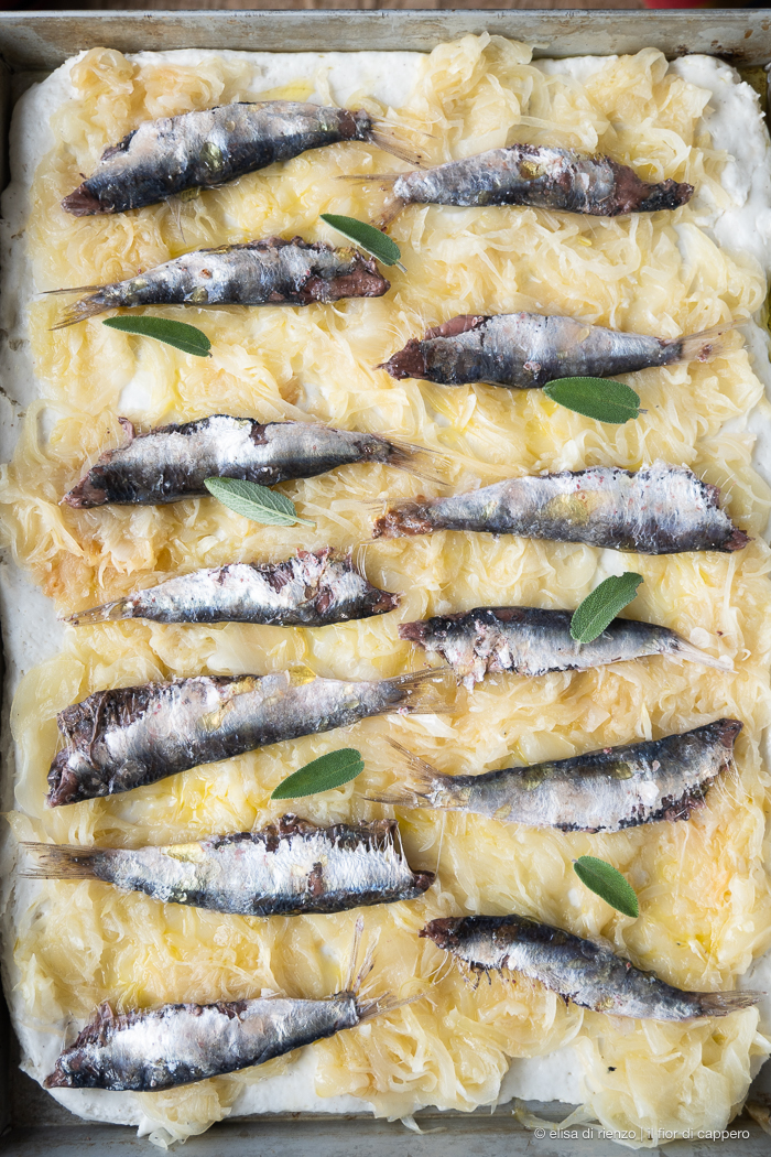 - Stendete l’impasto lievitata con uno spessore di un centimetro. Sistematelo in una teglia da forno leggermente unta sul fondo. Coprite la pasta con la farcia di cipolle e distribuite sopra le sarde.